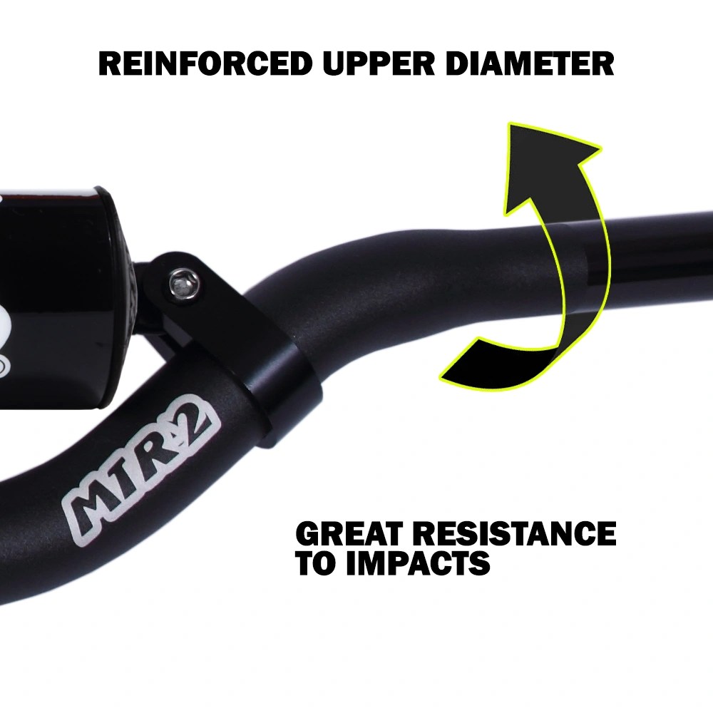 The handlebar offers the same finishes as the 2.1 Series, unlike its composition in 6061 T6 Aluminum, a new concept due to its greater diameter of 28.6 mm at the top just in the curve before the controls with the standard measure Unlike other handlebars, this will offer greater resistance in the event of a fall.